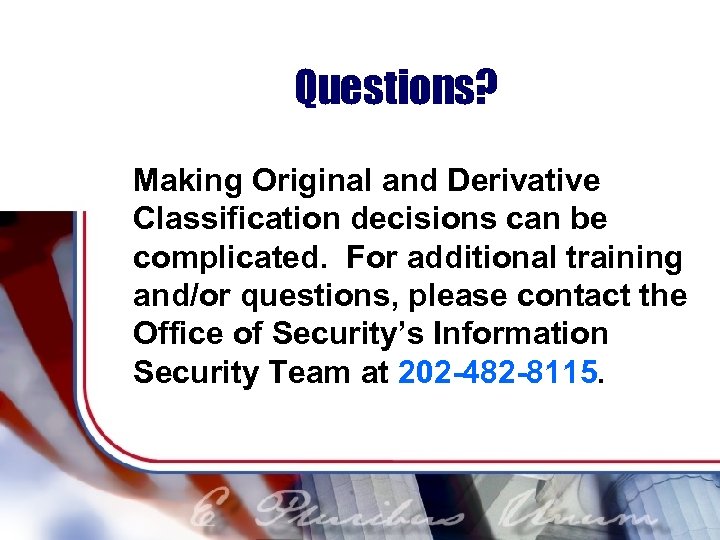 Questions? Making Original and Derivative Classification decisions can be complicated. For additional training and/or questions, please contact the Office of Security’s Information Security Team at 202 -482 -8115.