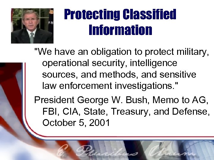 Protecting Classified Information "We have an obligation to protect military, operational security, intelligence sources, and methods, and sensitive law enforcement investigations. " President George W. Bush, Memo to AG, FBI, CIA, State, Treasury, and Defense, October 5, 2001
