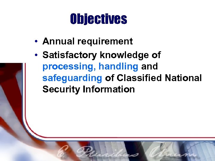 Objectives • Annual requirement • Satisfactory knowledge of processing, handling and safeguarding of Classified National Security Information