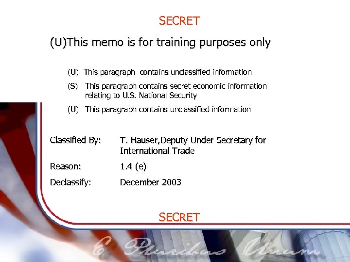 SECRET (U)This memo is for training purposes only (U) This paragraph contains unclassified information (S) This paragraph contains secret economic information relating to U. S. National Security (U) This paragraph contains unclassified information Classified By: T. Hauser, Deputy Under Secretary for International Trade Reason: 1. 4 (e) Declassify: December 2003 SECRET