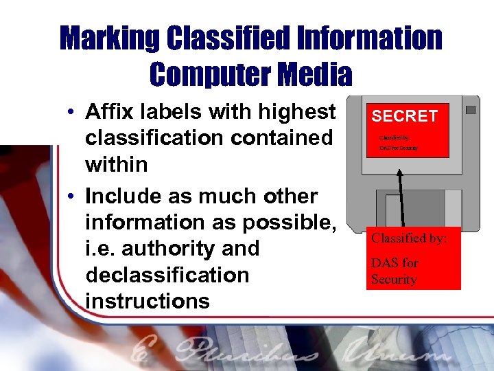 Marking Classified Information Computer Media • Affix labels with highest classification contained within • Include as much other information as possible, i. e. authority and declassification instructions SECRET Classified by: DAS for Security