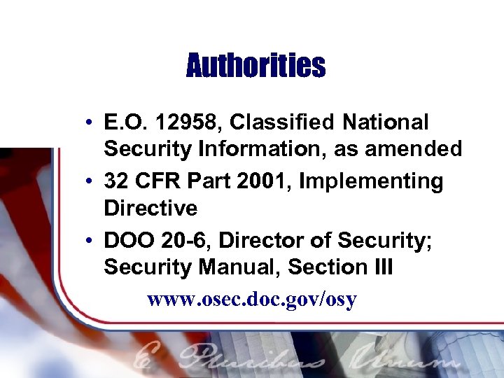 Authorities • E. O. 12958, Classified National Security Information, as amended • 32 CFR Part 2001, Implementing Directive • DOO 20 -6, Director of Security; Security Manual, Section III www. osec. doc. gov/osy