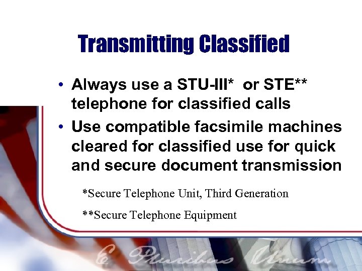 Transmitting Classified • Always use a STU-III* or STE** telephone for classified calls • Use compatible facsimile machines cleared for classified use for quick and secure document transmission *Secure Telephone Unit, Third Generation **Secure Telephone Equipment