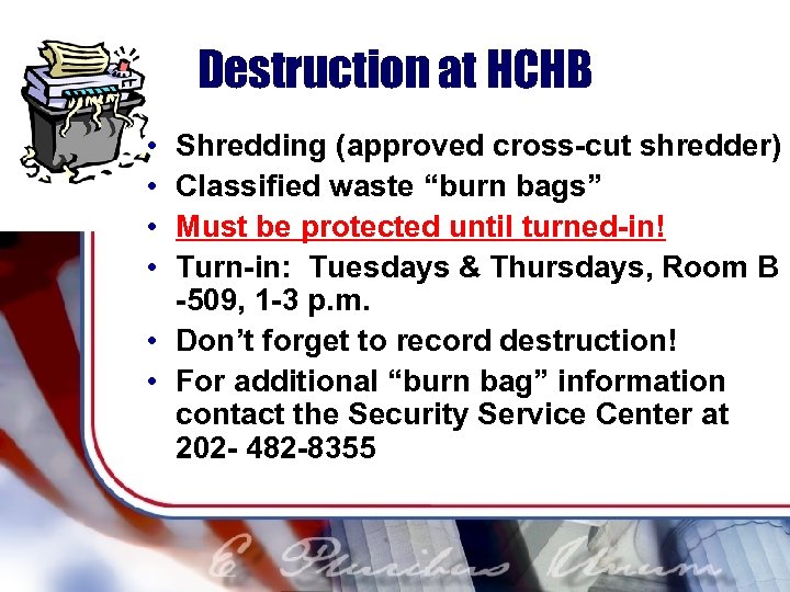 Destruction at HCHB • • Shredding (approved cross-cut shredder) Classified waste “burn bags” Must be protected until turned-in! Turn-in: Tuesdays & Thursdays, Room B -509, 1 -3 p. m. • Don’t forget to record destruction! • For additional “burn bag” information contact the Security Service Center at 202 - 482 -8355