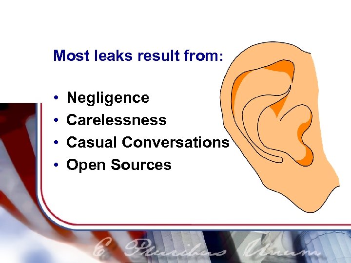 Most leaks result from: • • Negligence Carelessness Casual Conversations Open Sources