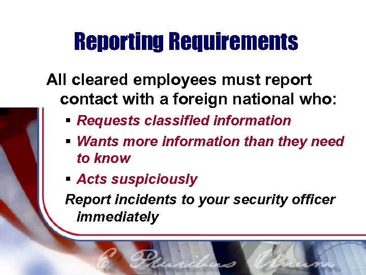 Reporting Requirements All cleared employees must report contact with a foreign national who: § Requests classified information § Wants more information than they need to know § Acts suspiciously Report incidents to your security officer immediately