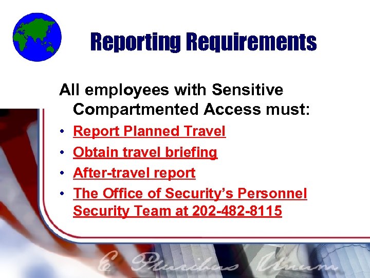 Reporting Requirements All employees with Sensitive Compartmented Access must: • • Report Planned Travel Obtain travel briefing After-travel report The Office of Security’s Personnel Security Team at 202 -482 -8115