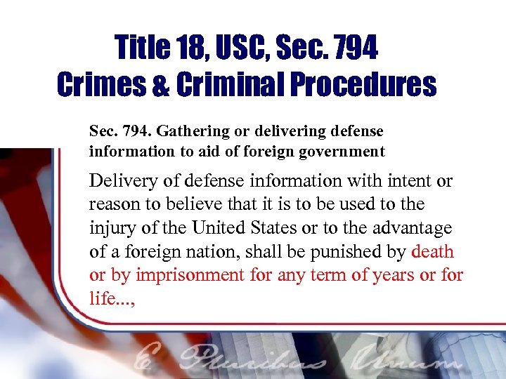 Title 18, USC, Sec. 794 Crimes & Criminal Procedures Sec. 794. Gathering or delivering defense information to aid of foreign government Delivery of defense information with intent or reason to believe that it is to be used to the injury of the United States or to the advantage of a foreign nation, shall be punished by death or by imprisonment for any term of years or for life. . . ,