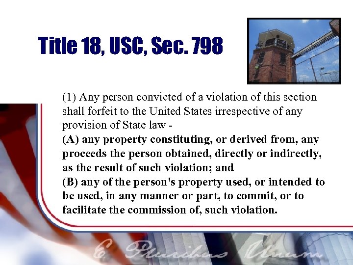 Title 18, USC, Sec. 798 (1) Any person convicted of a violation of this section shall forfeit to the United States irrespective of any provision of State law (A) any property constituting, or derived from, any proceeds the person obtained, directly or indirectly, as the result of such violation; and (B) any of the person's property used, or intended to be used, in any manner or part, to commit, or to facilitate the commission of, such violation.