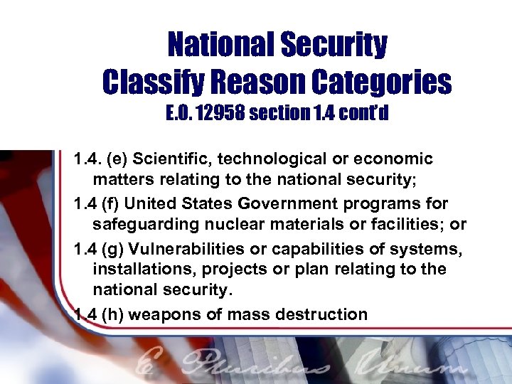 National Security Classify Reason Categories E. O. 12958 section 1. 4 Classified information must fall under one of the following categories: 1. 4 (a) Military plans, weapons systems, or operations; 1. 4 (b) Foreign government information; 1. 4 (c) Intelligence activities, sources or methods or cryptology; 1. 4 (d) Foreign relations or foreign activities of the United States including confidential sources;