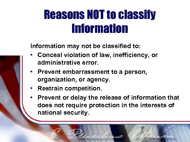 Reasons NOT to classify Information may not be classified to: • Conceal violation of law, inefficiency, or administrative error. • Prevent embarrassment to a person, organization, or agency. • Restrain competition. • Prevent or delay the release of information that does not require protection in the interests of national security.