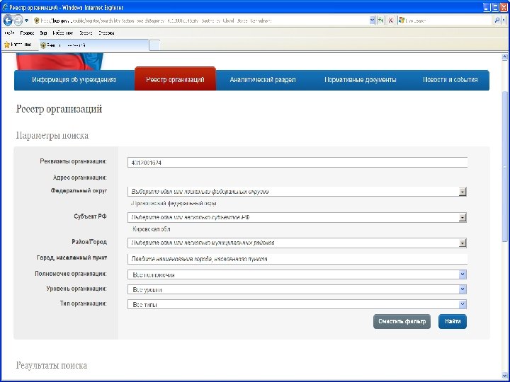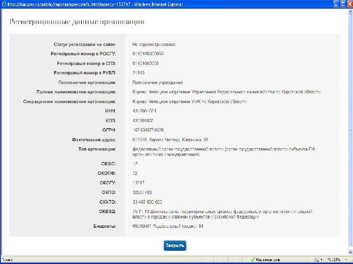 Проверка сведений об организации на сайте ГМУ • • • Заходим на сайт «bus. gov. ru» Выбираем пункт меню «Реестр организаций» Выбираем федеральный округ «Приволжский федеральный округ» Выбираем субъект РФ «Кировская область» Вводим свой ИНН в «Реквизитах организации» Нажимаем кнопку «Найти»