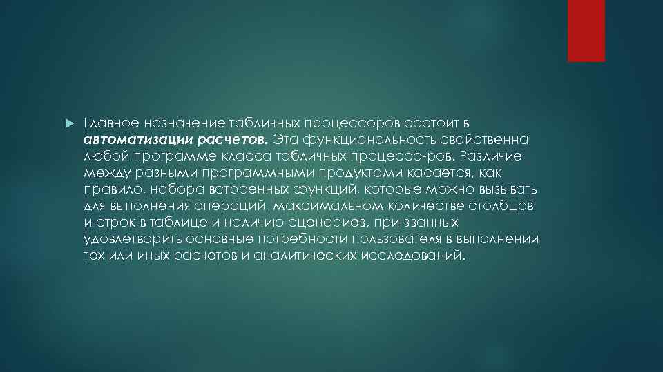 Главное назначение табличных процессоров состоит в автоматизации расчетов. Эта функциональность свойственна любой программе класса табличных процессо ров. Различие между разными программными продуктами касается, как правило, набора встроенных функций, которые можно вызывать для выполнения операций, максимальном количестве столбцов и строк в таблице и наличию сценариев, при званных удовлетворить основные потребности пользователя в выполнении тех или иных расчетов и аналитических исследований.