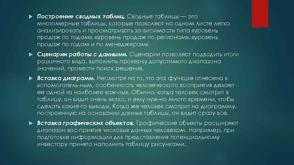 Построение сводных таблиц. Сводные таблицы — это многомерные таблицы, которые позволяют на одном листе легко анализировать и просматривать за висимости типа «уровень продаж по годам» , «уровень продаж по регионам» , «уровень продаж по годам и по менеджерам» . Сценарии работы с данными. Сценарии позволяют подводить итоги различного вида, выполнить проверку допустимого диапазона значений, провести поиск решения. Вставка диаграмм. Несмотря на то, что эта функция отнесена к вспомогатель ным, особенность человеческого восприятия делает ее одной из наиболее важ ных. Обычно, когда человек смотрит в таблицу, он видит очень мало, и ему нуж но много времени, чтобы сделать какие то выводы. Когда же человек смотрит на диаграмму, построенную на основании данных таблицы, он видит сразу все. Вставка графических объектов. Графические объекты расширяют диапазон вос приятия числовых данных человеком. Например, при подготовке информации для представления потенциальному инвестору принято наполнить таблицу рисунками.