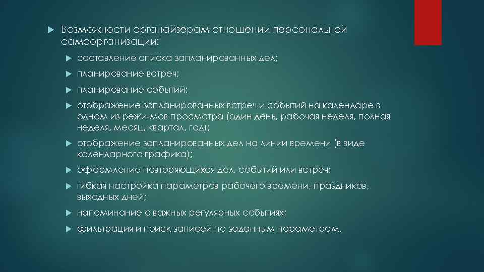 Возможности органайзерам отношении персональной самоорганизации: составление списка запланированных дел; планирование встреч; планирование событий; отображение запланированных встреч и событий на календаре в одном из режи мов просмотра (один день, рабочая неделя, полная неделя, месяц, квартал, год); отображение запланированных дел на линии времени (в виде календарного графика); оформление повторяющихся дел, событий или встреч; гибкая настройка параметров рабочего времени, праздников, выходных дней; напоминание о важных регулярных событиях; фильтрация и поиск записей по заданным параметрам.