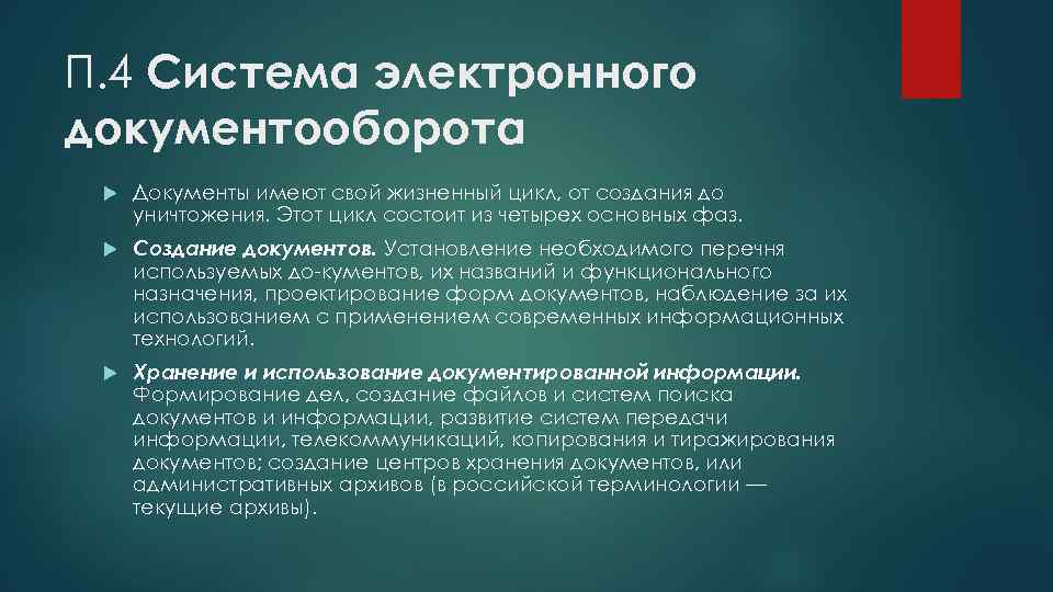 П. 4 Система электронного документооборота Документы имеют свой жизненный цикл, от создания до уничтожения. Этот цикл состоит из четырех основных фаз. Создание документов. Установление необходимого перечня используемых до кументов, их названий и функционального назначения, проектирование форм документов, наблюдение за их использованием с применением современных информационных технологий. Хранение и использование документированной информации. Формирование дел, создание файлов и систем поиска документов и информации, развитие систем передачи информации, телекоммуникаций, копирования и тиражирования документов; создание центров хранения документов, или административных архивов (в российской терминологии — текущие архивы).