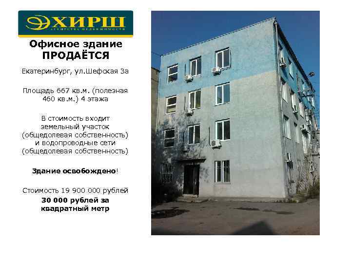 Офисное здание ПРОДАЁТСЯ Екатеринбург, ул. Шефская 3 а Площадь 667 кв. м. (полезная 460 кв. м. ) 4 этажа В стоимость входит земельный участок (общедолевая собственность) и водопроводные сети (общедолевая собственность) Здание освобождено! Стоимость 19 900 000 рублей 30 000 рублей за квадратный метр