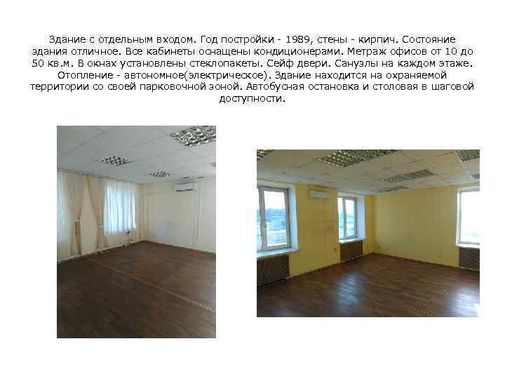 Здание с отдельным входом. Год постройки - 1989, стены - кирпич. Состояние здания отличное. Все кабинеты оснащены кондиционерами. Метраж офисов от 10 до 50 кв. м. В окнах установлены стеклопакеты. Сейф двери. Санузлы на каждом этаже. Отопление - автономное(электрическое). Здание находится на охраняемой территории со своей парковочной зоной. Автобусная остановка и столовая в шаговой доступности.