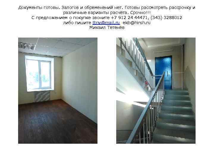 Документы готовы. Залогов и обременений нет. Готовы рассмотреть рассрочку и различные варианты расчёта. Срочно!!! С предложением о покупке звоните +7 912 24 44471, (343) 3288012 либо пишите ttnv@mail. ru ekb@hirsh. ru Михаил Тетенёв