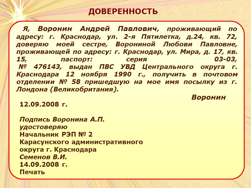 ДОВЕРЕННОСТЬ Я, Воронин Андрей Павлович, проживающий по адресу: г. Краснодар, ул. 2-я Пятилетка, д.24, кв. 72, доверяю моей сестре, Ворониной Любови Павловне, проживающей по адресу: г. Краснодар, ул. Мира, д. 17, кв. 15, паспорт: серия 03-03, № 476143, выдан ПВС УВД Центрального округа г. Краснодара 12 ноября 1990 г., получить в почтовом отделении № 58 пришедшую на мое имя посылку из г. Лондона (Великобритания). Воронин 12.09.2008 г. Подпись Воронина А.П. удостоверяю Начальник РЭП № 2 Карасунского административного округа г. Краснодара Семенов В.И. 14.09.2008 г. Печать
