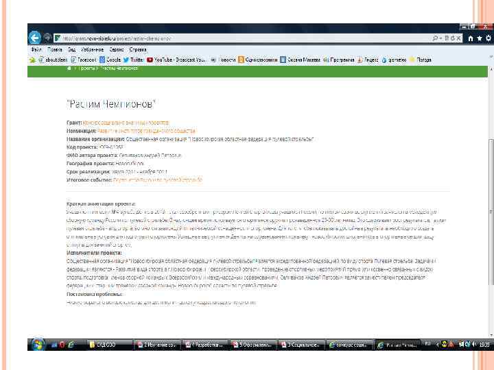 РАЗДЕЛЫ ЗАЯВКИ Краткая аннотация проекта (не более 1500 тыс. символов); Исполнители проекта (не более 2000 тыс. символов); Постановка проблемы (не более 1500 тыс. символов); Цель проекта (не более 160 символов); Задачи; Механизмы и способы достижения цели; Конкретные ожидаемые результаты; Календарный план работ (наименование работ, срок, ответственный исполнитель).