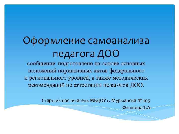 Оформление самоанализа педагога ДОО сообщение подготовлено на основе основных положений нормативных актов федерального и регионального уровней, а также методических рекомендаций по аттестации педагогов ДОО. Старший воспитатель МБДОУ г. Мурманска № 105 Фишкова Т. А.