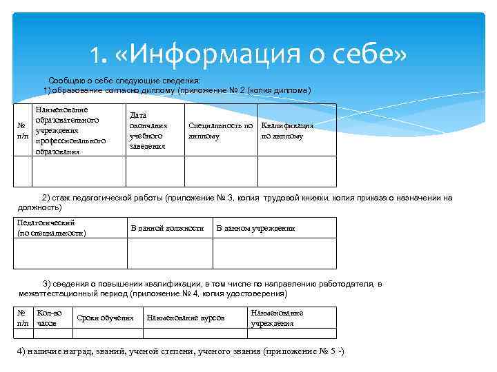 1. «Информация о себе» Сообщаю о себе следующие сведения: 1) образование согласно диплому (приложение № 2 (копия диплома) Наименование образовательного № учреждения п/п профессионального образования Дата окончания учебного заведения Специальность по Квалификация диплому по диплому 2) стаж педагогической работы (приложение № 3, копия трудовой книжки, копия приказа о назначении на должность) Педагогический (по специальности) В данной должности В данном учреждении 3) сведения о повышении квалификации, в том числе по направлению работодателя, в межаттестационный период (приложение № 4, копия удостоверения) № п/п Кол-во часов Сроки обучения Наименование курсов Наименование учреждения 4) наличие наград, званий, ученой степени, ученого звания (приложение № 5 -)