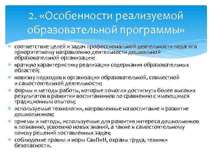 2. «Особенности реализуемой образовательной программы» соответствие целей и задач профессиональной деятельности педагога приоритетному направлению деятельности дошкольной образовательной организации; краткую характеристику реализации содержания образовательных областей; новизну подходов к организации образовательной, совместной и самостоятельной деятельности; формы и методы работы, которые помогли достигнуть более высоких результатов в развитии воспитанников по сравнению с имеющимся традиционным опытом; используемые технологии, направленные на воспитание и развитие дошкольников; приемы и методы, используемые для развития интереса дошкольников к познанию, усвоению новых знаний, а также к самостоятельному поиску решений поставленных задач; соблюдение правил и норм Сан. Пи. Н, охраны труда, техники безопасности.