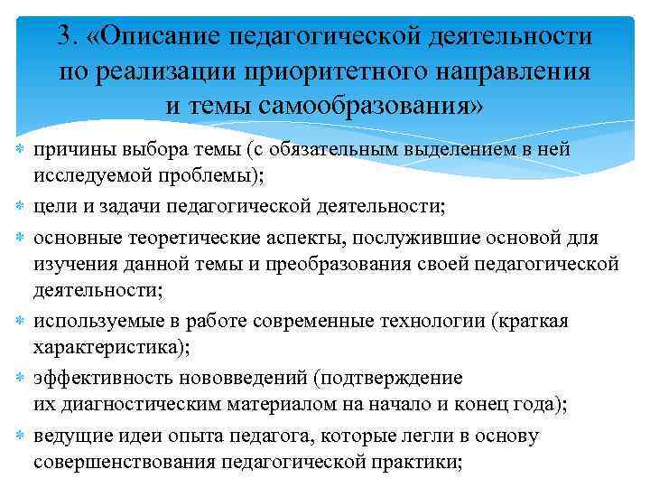3. «Описание педагогической деятельности по реализации приоритетного направления и темы самообразования» причины выбора темы (с обязательным выделением в ней исследуемой проблемы); цели и задачи педагогической деятельности; основные теоретические аспекты, послужившие основой для изучения данной темы и преобразования своей педагогической деятельности; используемые в работе современные технологии (краткая характеристика); эффективность нововведений (подтверждение их диагностическим материалом на начало и конец года); ведущие идеи опыта педагога, которые легли в основу совершенствования педагогической практики;