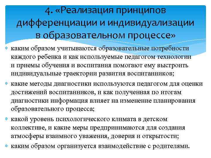 4. «Реализация принципов дифференциации и индивидуализации в образовательном процессе» каким образом учитываются образовательные потребности каждого ребенка и как используемые педагогом технологии и приемы обучения и воспитания помогают ему выстроить индивидуальные траектории развития воспитанников; какие методы диагностики используются педагогом для оценки достижений воспитанников, и как полученная по итогам диагностики информация влияет на изменение планирования образовательного процесса; какой уровень психологического климата в детском коллективе, и какие меры предпринимаются для создания атмосферы взаимного уважения, доверия и открытости; каким образом организуется взаимодействие с родителями.