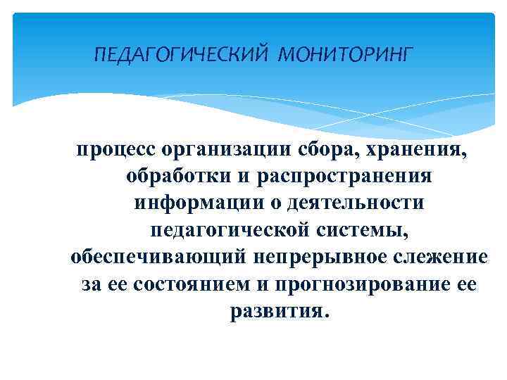 ПЕДАГОГИЧЕСКИЙ МОНИТОРИНГ процесс организации сбора, хранения, обработки и распространения информации о деятельности педагогической системы, обеспечивающий непрерывное слежение за ее состоянием и прогнозирование ее развития.