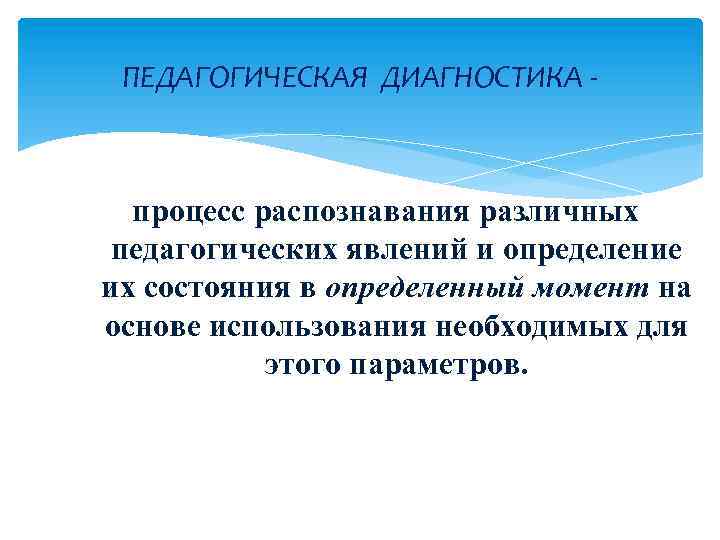 ПЕДАГОГИЧЕСКАЯ ДИАГНОСТИКА - процесс распознавания различных педагогических явлений и определение их состояния в определенный момент на основе использования необходимых для этого параметров.