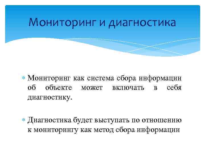 Мониторинг и диагностика Мониторинг как система сбора информации об объекте может включать в себя диагностику. Диагностика будет выступать по отношению к мониторингу как метод сбора информации