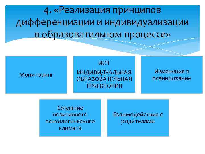 4. «Реализация принципов дифференциации и индивидуализации в образовательном процессе» Мониторинг ИОТ ИНДИВИДУАЛЬНАЯ ОБРАЗОВАТЕЛЬНАЯ ТРАЕКТОРИЯ Создание позитивного психологического климата Изменения в планирование Взаимодействие с родителями