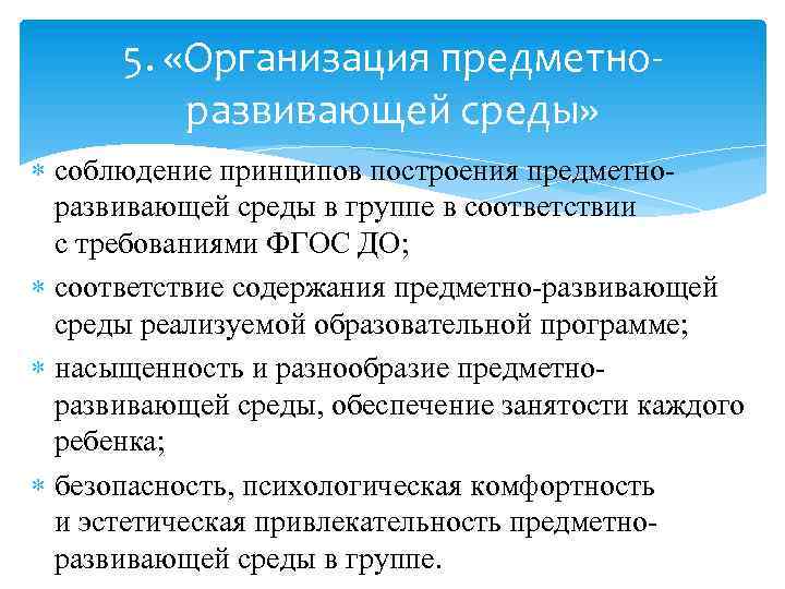 5. «Организация предметноразвивающей среды» соблюдение принципов построения предметноразвивающей среды в группе в соответствии с требованиями ФГОС ДО; соответствие содержания предметно-развивающей среды реализуемой образовательной программе; насыщенность и разнообразие предметноразвивающей среды, обеспечение занятости каждого ребенка; безопасность, психологическая комфортность и эстетическая привлекательность предметноразвивающей среды в группе.