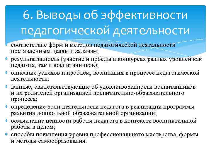 6. Выводы об эффективности педагогической деятельности соответствие форм и методов педагогической деятельности поставленным целям и задачам; результативность (участие и победы в конкурсах разных уровней как педагога, так и воспитанников); описание успехов и проблем, возникших в процессе педагогической деятельности; данные, свидетельствующие об удовлетворенности воспитанников и их родителей организацией воспитательно-образовательного процесса; определение роли деятельности педагога в реализации программы развития дошкольной образовательной организации; осмысление ценности работы педагога в контексте воспитательной работы в целом; способы повышения уровня профессионального мастерства, формы и методы самообразования.