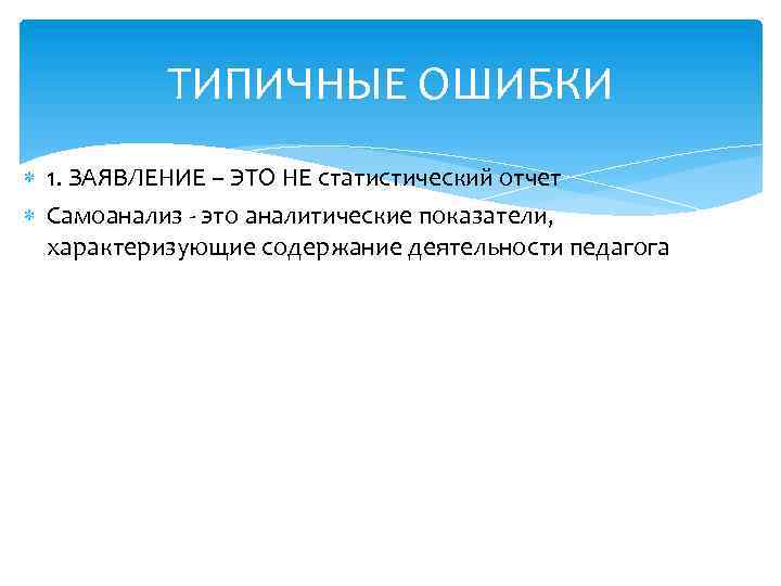 ТИПИЧНЫЕ ОШИБКИ 1. ЗАЯВЛЕНИЕ – ЭТО НЕ статистический отчет Самоанализ - это аналитические показатели, характеризующие содержание деятельности педагога