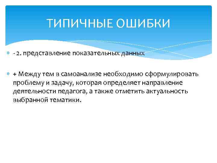 ТИПИЧНЫЕ ОШИБКИ - 2. представление показательных данных + Между тем в самоанализе необходимо сформулировать проблему и задачу, которая определяет направление деятельности педагога, а также отметить актуальность выбранной тематики.