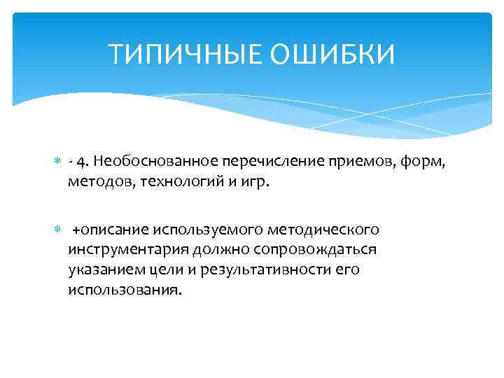 ТИПИЧНЫЕ ОШИБКИ - 4. Необоснованное перечисление приемов, форм, методов, технологий и игр. +описание используемого методического инструментария должно сопровождаться указанием цели и результативности его использования.