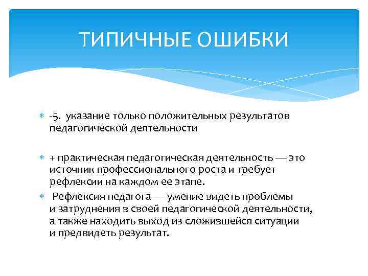 ТИПИЧНЫЕ ОШИБКИ -5. указание только положительных результатов педагогической деятельности + практическая педагогическая деятельность — это источник профессионального роста и требует рефлексии на каждом ее этапе. Рефлексия педагога — умение видеть проблемы и затруднения в своей педагогической деятельности, а также находить выход из сложившейся ситуации и предвидеть результат.