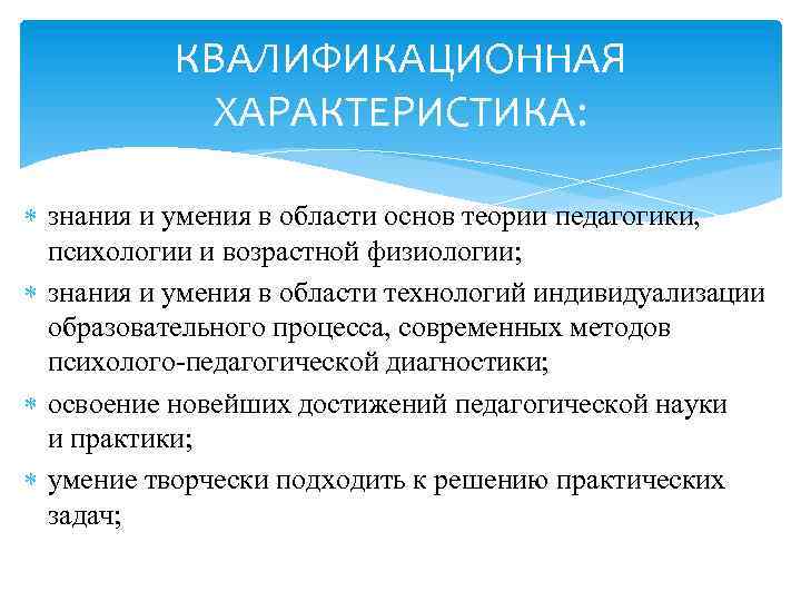 КВАЛИФИКАЦИОННАЯ ХАРАКТЕРИСТИКА: знания и умения в области основ теории педагогики, психологии и возрастной физиологии; знания и умения в области технологий индивидуализации образовательного процесса, современных методов психолого-педагогической диагностики; освоение новейших достижений педагогической науки и практики; умение творчески подходить к решению практических задач;