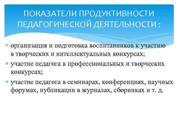 ПОКАЗАТЕЛИ ПРОДУКТИВНОСТИ ПЕДАГОГИЧЕСКОЙ ДЕЯТЕЛЬНОСТИ : организация и подготовка воспитанников к участию в творческих и интеллектуальных конкурсах; участие педагога в профессиональных и творческих конкурсах; участие педагога в семинарах, конференциях, научных форумах, публикации в журналах, сборниках и т. д.