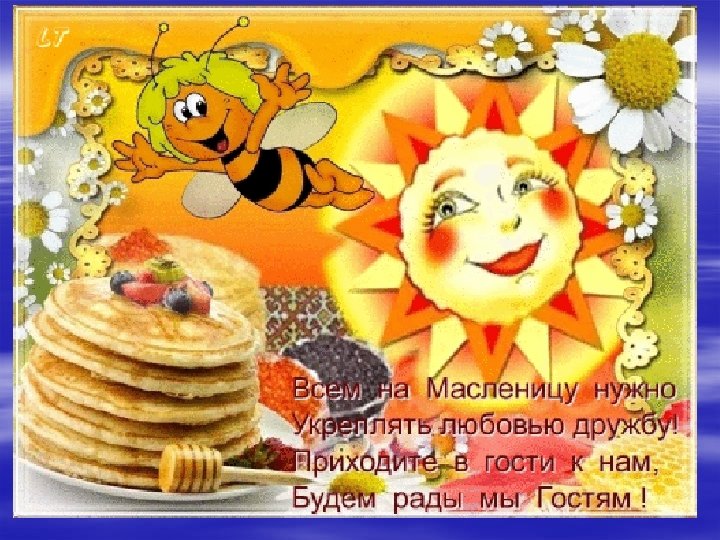 § От души вас поздравляем И сердечно приглашаем: Все заботы бросьте, Приходите в гости, Прямо к нашему крыльцу К нам на Масленицу.