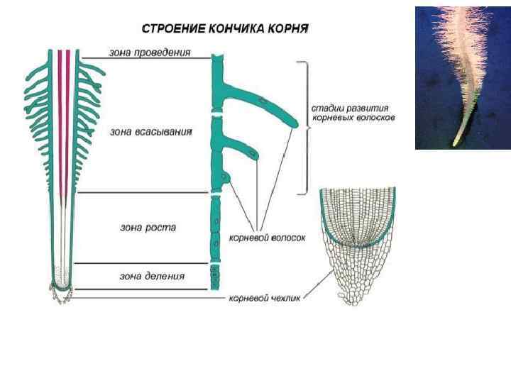 Поглощение минеральных веществ через зону всасывания Зона всасывания содержит корневые волоски, через которые осуществляется поглощение воды с растворенными в ней минеральными веществами.
