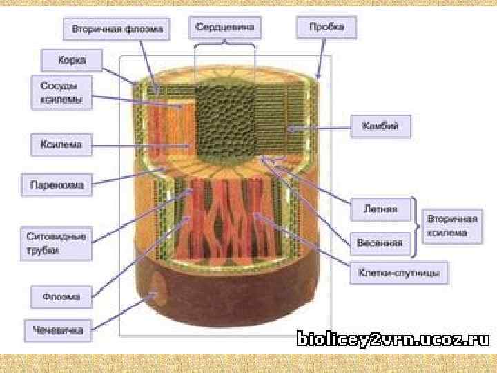 • За да ние 4 № 1597. Какая ткань рас по ло же на между дре ве си ной и лубом в ство ле липы? • 1) по кров ная • 2) фо то син те зи ру ю щая • 3) об ра зо ва тель ная • 4) ос нов ная • По яс не ние. • Между дре ве си ной и лубом рас по ла га ет ся кам бий. • Кам бий — об ра зо ва тель ная ткань. За счёт де ле ния и диф фе рен ци а ции его кле ток сна ру жи об ра зу ют ся клет ки луба (вто рич ная кора), а внут ри — клет ки дре ве си ны. Рост стеб ля в тол щи ну про ис хо дит бла го да ря де я тель но сти кле ток кам бия. •