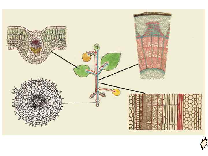Основная паренхима • Из клеток основной паренхимы образуются различные анатомические комплексы: • сердцевина стебля, способная запасать питательные вещества; • сердцевинные лучи древесины, по которым осуществляется радиальный транспорт веществ; • горизонтальная паренхима, или сердцевинные лучи вторичной коры, расположенные между участками флоэмы и связанные с радиальным транспортом веществ; • вертикальная паренхима, входящая в состав вторичной флоэмы, где она может запасать питательные веществ; • основная паренхима в составе коры корня первичного анатомического строения, а также проводящих пучков у двудольных покрытосеменных.