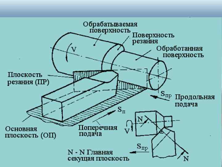 8 7 Элементы токарного проходного резца: 1 - вспомогательная режущая кромка; 2 - вспомогательная задняя поверхность; 3 - вершина резца; 4 - главная задняя поверхность; 5 - главная режущая кромка; 6 - передняя поверхность; 7 – головка резца, 8 – тело резца.