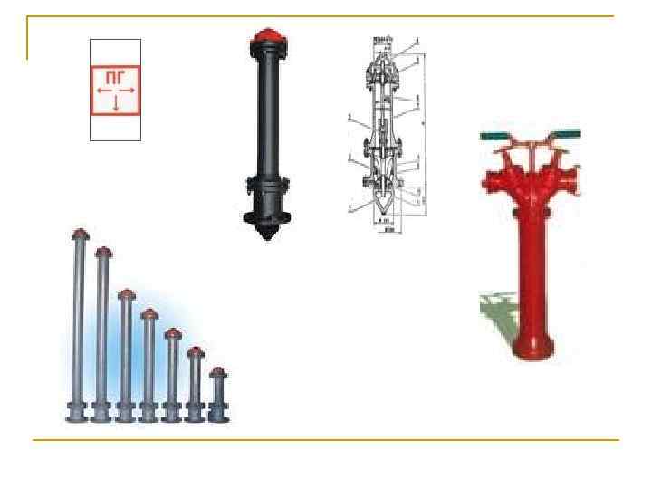 Для наружного пожаротушения n по всей территории предприятия (или стройплощадки) на сети противопожарного водоснабжения устанавливаются пожарные гидранты на расстоянии: q q q n не более 150 м друг от друга; не более 2, 5 м от дороги; не менее 5 м от стен здания. В зависимости от создаваемого давления сети подразделяются на: q q * высокого давления – напора достаточно для создания компактной струи высотой 10 м (из пожарного ствола диаметром 19 мм) над самой высокой точкой застройки; низкого давления – то же над поверхностью земли.