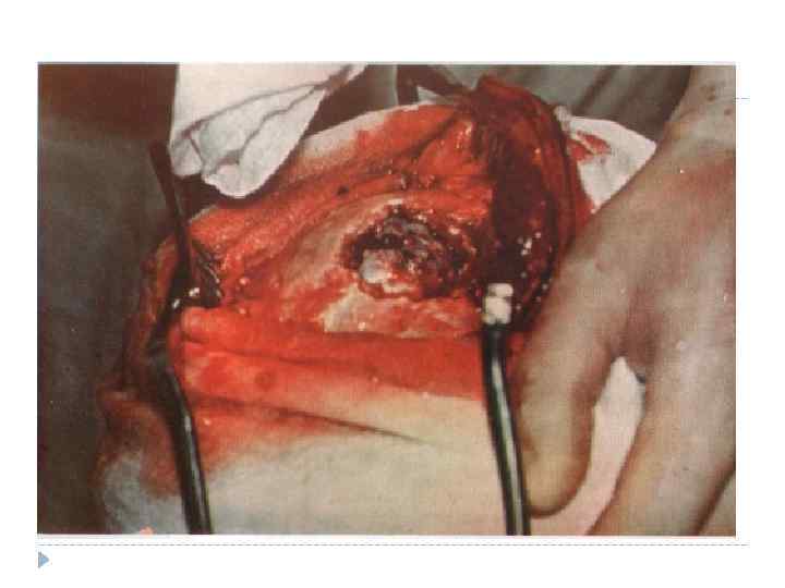 Классификация Огнестрельные ранения черепа и мозга Ранения мягких тканей (без повреждения кости) Непроникающие ранения черепа (экстрадуральные) Проникающие ранения черепа и ГМ (интрадуральные) • Слепые; • Сквозные; • Касательные; • Пулевые; • Осколочные.