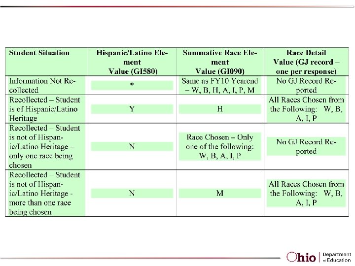 Student Race/Ethnicity • For most purposes, ODE will use the Summative Racial/Ethnic Group element on Student Demo record – If not recollected, this value must be same as current Racial/Ethnic Group – If recollected, will be derived based on new element and record